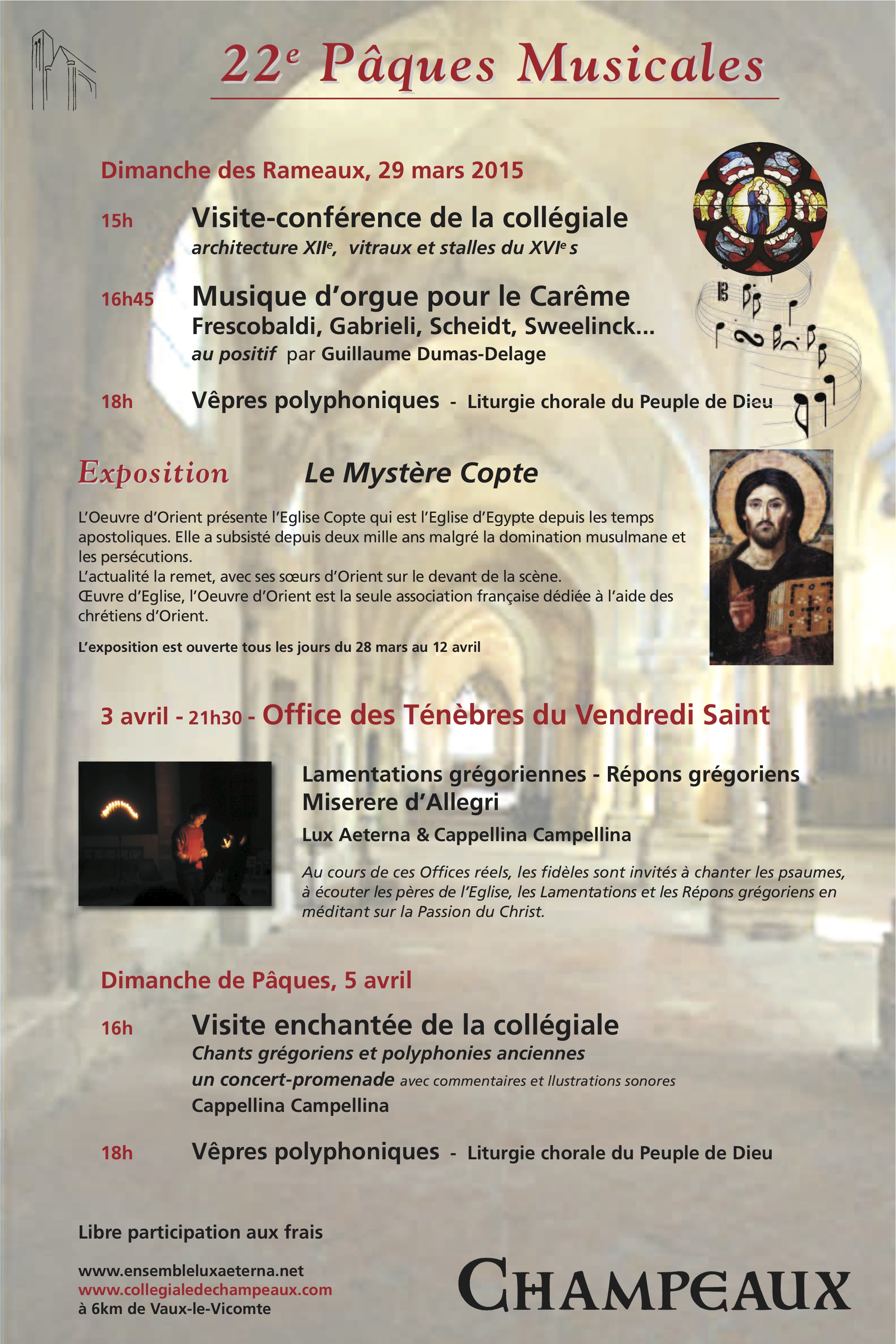 L’ensemble Lux Aeterna fut très heureux de participer à l’Office des Ténèbres du Vendredi Saint 3 avril 2015, au sein de la très belle Collégiale Saint-Martin de Champeaux en Seine-et-Marne (classée monument historique), dans le cadre des 22èmes Pâques Musicales !